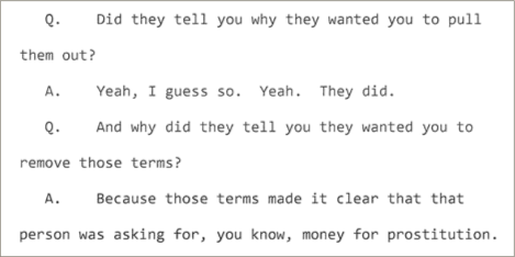 Of course what he left unsaid was all this business about the precise practice of “moderation” that went on. Quietly in the background Backpage’s “moderators” were hard at work sanitizing key words (“lolita”, “teenage”, “rape”,“young”, “little girl”, etc.) and manually removing images that indicated the ad was for sex, after which “moderators” would post the remainder of the ad.