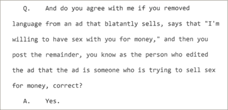 For example, a former “moderator” admitted in his deposition that his job as a moderator for the Backpage was “to basically sanitize ads for prostitution.” He flatly admitted he sanitized ads by removing terms or images that suggested the ads were for sex for money. He would then post the sanitized ad, even though he knew the ad was placed by a pimp trying to sell sex for money.