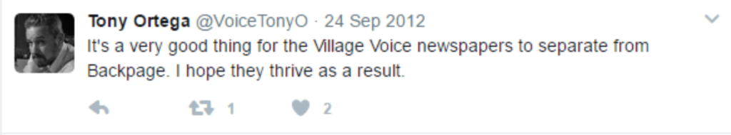 But again this was all part of the plan. The Village Voice had served its purpose by that point and now the Backpage was set loose to become the world’s largest online brothel per the agreed upon arrangement. It was Tony Ortega oversaw the whole demise of The Village Voice and set the stage for the rise of the Backpage.